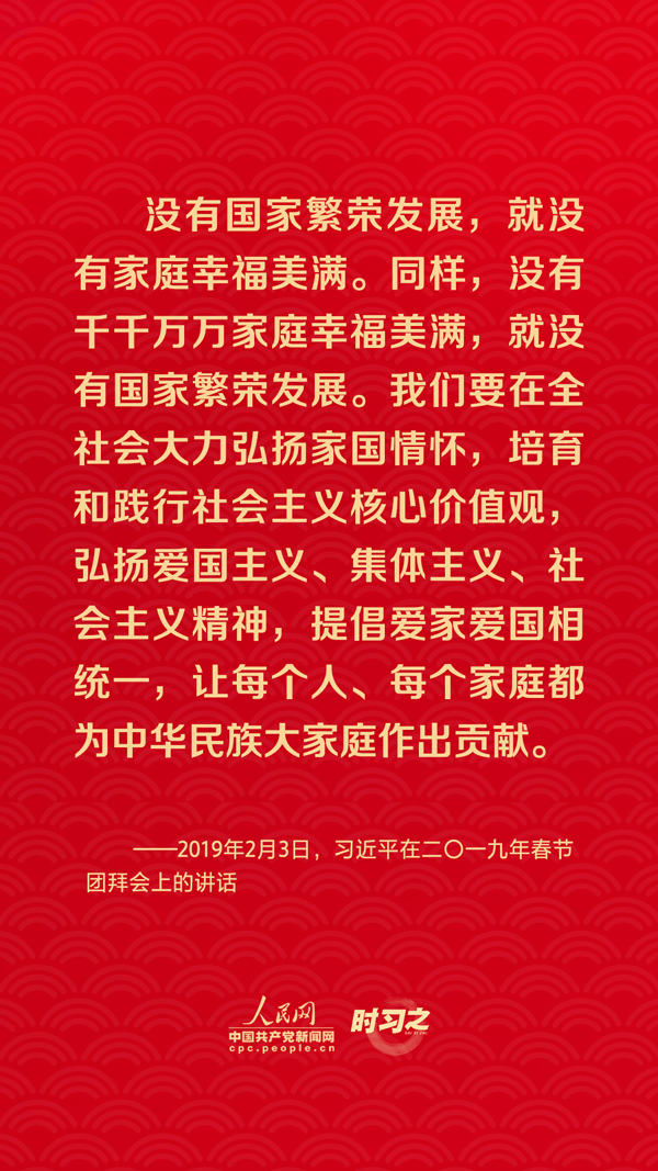 團(tuán)圓是春節(jié)永恒的主題?!皼](méi)有國(guó)家繁榮發(fā)展,就沒(méi)有家庭幸福美滿。同樣,沒(méi)有千千萬(wàn)萬(wàn)家庭幸福美滿,就沒(méi)有國(guó)家繁榮發(fā)展?!绷?xí)近平總書(shū)記曾在多個(gè)場(chǎng)合深刻闡述家庭與國(guó)家之間的關(guān)系,從他的話語(yǔ)里一起感悟深厚的家國(guó)情懷。