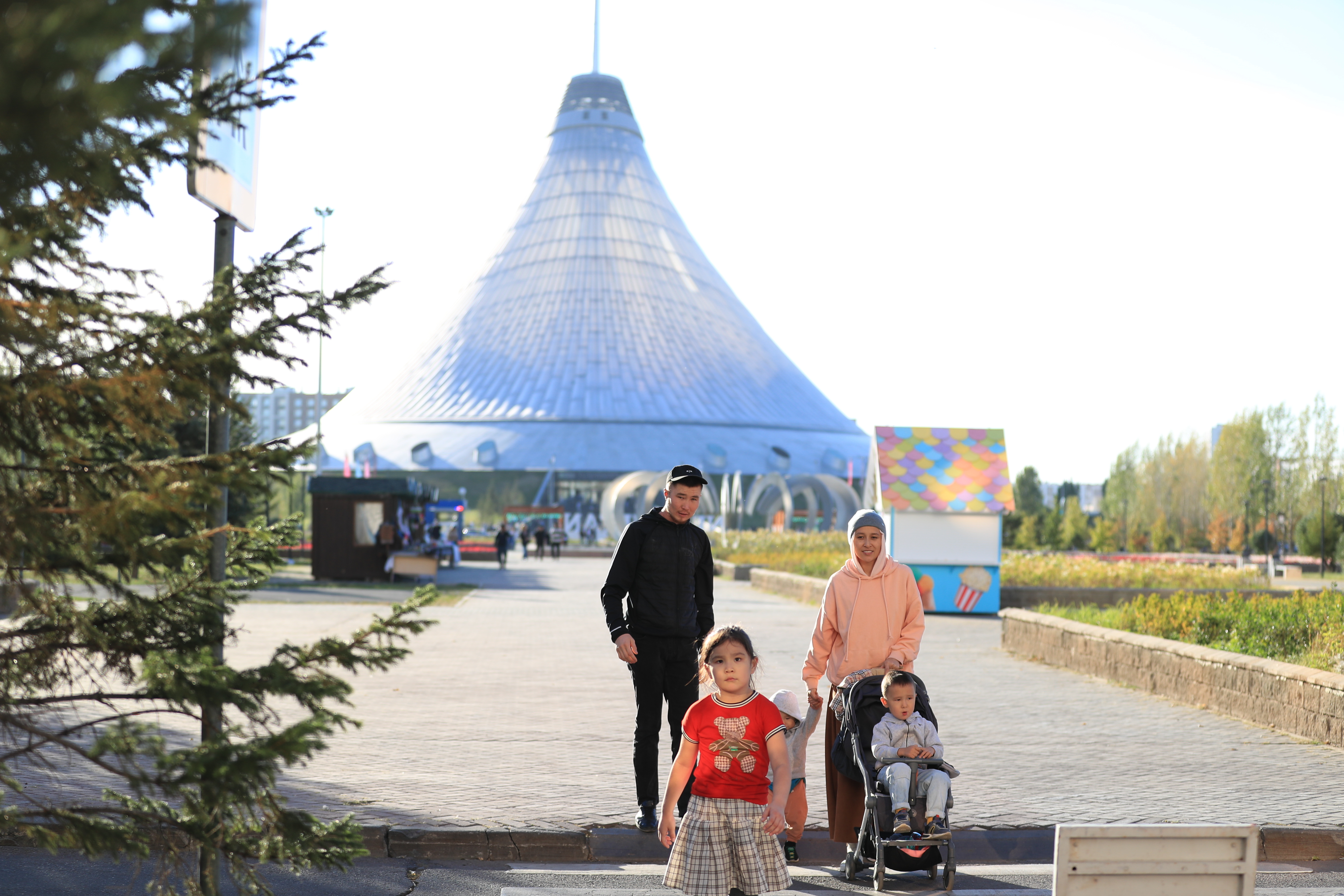 市民走在哈薩克斯坦首都街頭,他們身后是著名的“可汗之帳”購物中心。