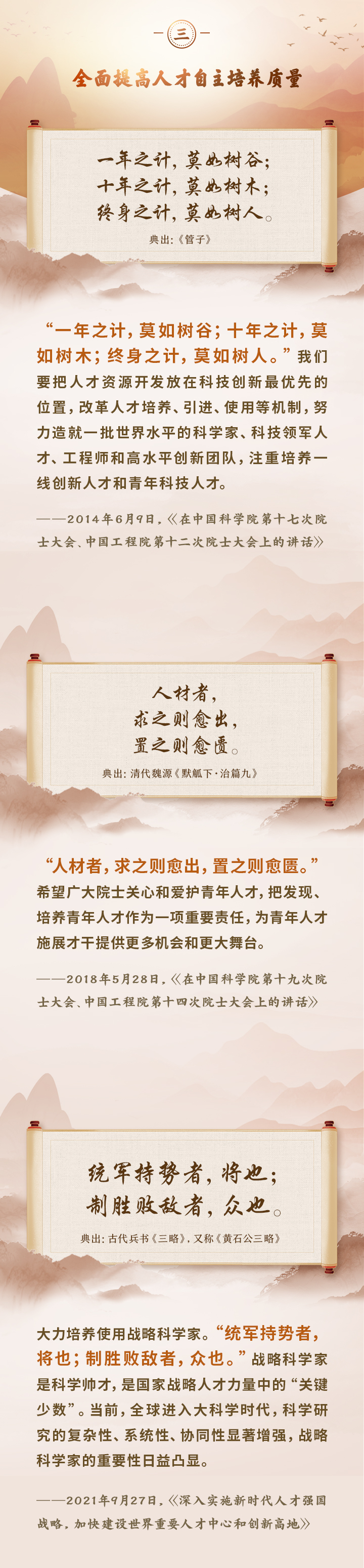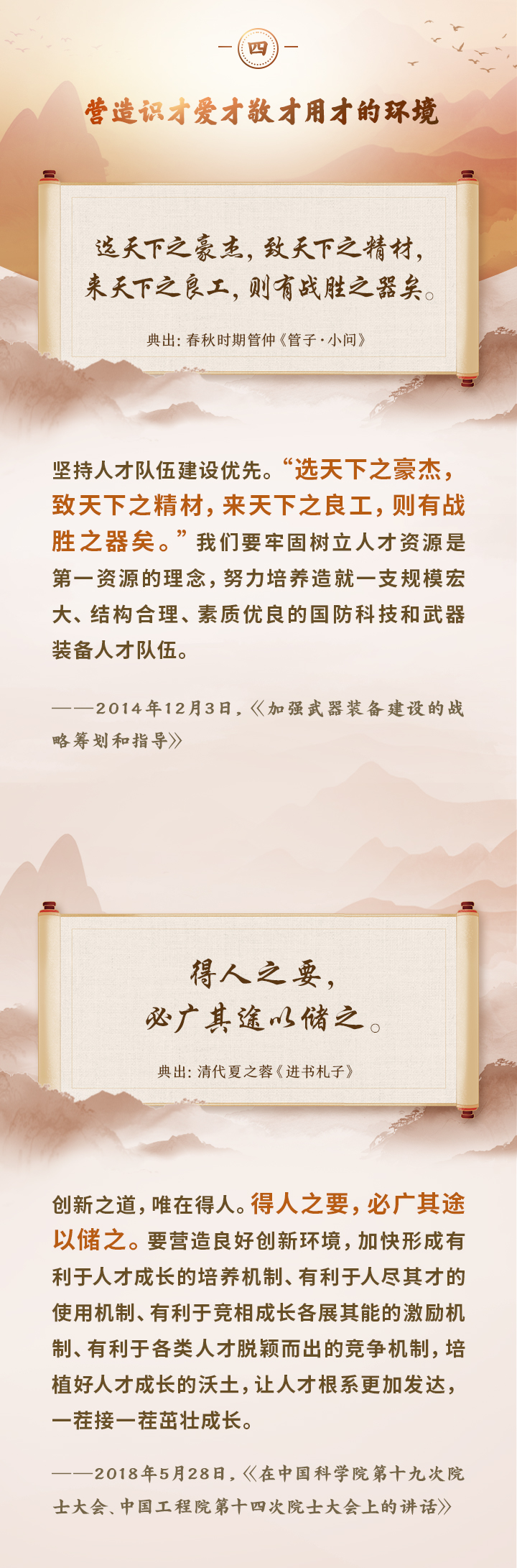 編者按:培養(yǎng)造就大批德才兼?zhèn)涞母咚刭|(zhì)人才,是國家和民族長遠(yuǎn)發(fā)展大計(jì)。黨的十八大以來,習(xí)近平總書記圍繞人才工作發(fā)表一系列重要論述,立意高遠(yuǎn),內(nèi)涵豐富,思想深刻,深刻回答了為什么建設(shè)人才強(qiáng)國、什么是人才強(qiáng)國、怎樣建設(shè)人才強(qiáng)國的重大理論和實(shí)踐問題。在這些重要論述中,總書記精妙運(yùn)用古代典籍、經(jīng)典名句,以古喻今、啟迪思想、激蕩精神,讓我們一起來學(xué)習(xí)!