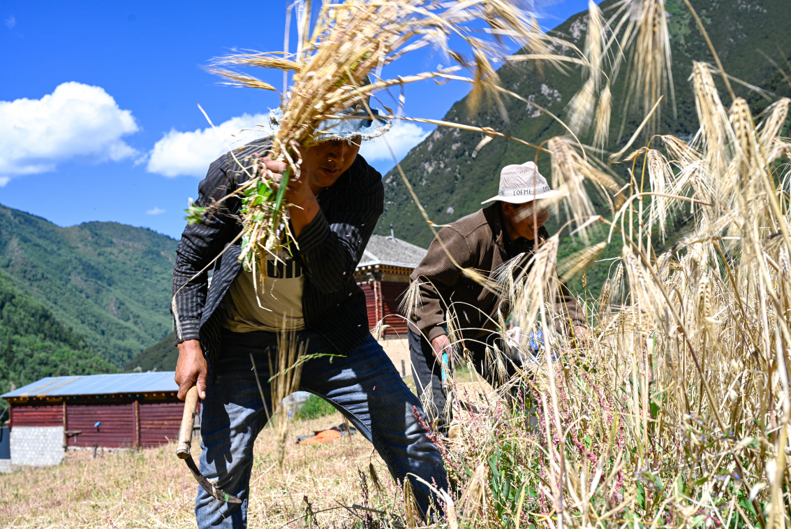 麻絨鄉(xiāng)干部根松拉姆介紹道:“當(dāng)前正值秋收季節(jié),今天我們組織鄉(xiāng)干部一大早就來到田間地頭,幫助村民收割青稞。今年德來村青稞種植面積達(dá)到 180 多畝,由于今年氣候相對(duì)平穩(wěn),畝產(chǎn)比去年更加理想,預(yù)計(jì)能實(shí)現(xiàn)3萬多公斤的產(chǎn)量。此外,不同于過去的傳統(tǒng)農(nóng)作方式,現(xiàn)在我們采用半機(jī)械化農(nóng)作方式,極大地方便了老百姓。”