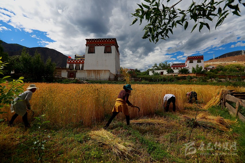 在青德鎮(zhèn)的田地里,隨處可見百姓忙碌收割的身影。熱龔村村民洛絨擁中雖然已忙得滿頭大汗,但是喜悅之情卻溢于言表,她說,由于今年風(fēng)調(diào)雨順,家里種植的青稞和小麥?zhǔn)粘杀韧暌?,趁這幾天天氣晴好抓緊搶收。筆者在地里看到,有不少收割完的農(nóng)戶正在幫助缺少勞動(dòng)力的家庭,大家相互協(xié)作確保顆粒歸倉。據(jù)了解, 今年鄉(xiāng)城縣小麥和青稞種植面積達(dá)3萬余畝,長勢普遍較好。