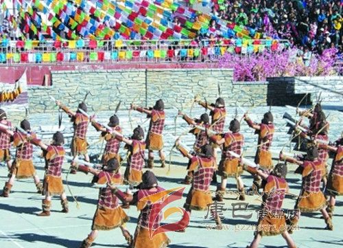 10月26日,在甲居藏寨,處處洋溢著豐收和歡樂的氣氛,人們扶老攜幼,身著節(jié)日的盛裝走到一起,來共同慶祝丹巴嘉絨風情節(jié)的順利召開。在一塊空地中,搭建了臨時的舞臺,看臺上,幾座古碉模型傲然挺立,在不遠處,一座古碉矗立在一座小山包上,與古碉模型遙相呼應(yīng)、相映成趣。上午9時40分,當節(jié)目主持人宣布嘉絨風情節(jié)正式開始時,一束束搖曳的煙花向空中飛去,在空中炸響后,散發(fā)出五顏六色的煙霧,其中有的還幻化成幾多小小的降落傘,就像多多盛開的鮮花在空中綻放。演出現(xiàn)場前的大地和遠處的小山坡上到處都站滿了熱情的觀眾,合著禮花的爆裂時的響聲,將手中的小紅旗展開,高舉過頭頂,有節(jié)奏的左右搖動,霎時間,整個現(xiàn)場成為了紅色的海洋。