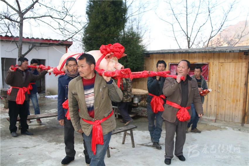 5個(gè)村民將年豬抬到秤上。360斤。村民為年豬準(zhǔn)備大紅花。準(zhǔn)備紙錢、香蠟。9點(diǎn)整,殺豬匠開始了他的工作,在眾人齊心協(xié)力下,光溜溜的年豬被打整干凈?!氨S游覀兇鍋砟觑L(fēng)調(diào)雨順、五谷豐登,村民平安健康。”村中老者敬過天地后,8個(gè)身強(qiáng)力壯的村民站在年豬旁,豎著拇指齊聲說,今年家家戶戶還要養(yǎng)大肥豬。抬著年豬,村里的中老年人簇?fù)碇?,走在最前面,唱著悅耳的民謠,大意是歌唱幸福生活的,迎著2018年的第一縷陽光,村民們喜氣洋洋。到村里來的游客蜂擁拍照。