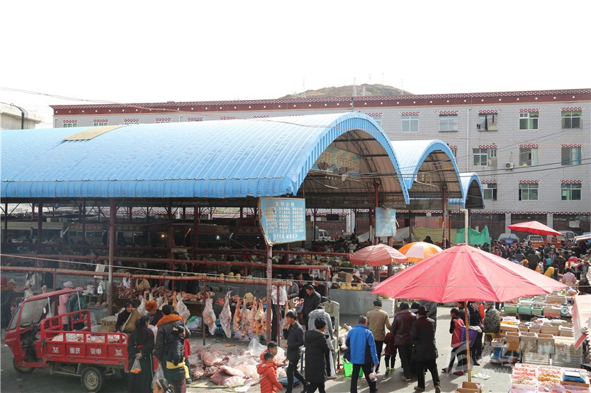 走進(jìn)康北農(nóng)貿(mào)市場(chǎng),筆者看到,一捆捆新鮮的綠色蔬菜、一塊塊剛剛宰好的牦牛肉、一箱箱水果整齊地?cái)[放在臺(tái)案上吸引著過往農(nóng)牧民群眾的眼球。不大的市場(chǎng)里熱鬧非凡,大家有人正忙著選購(gòu)牛肉、水果和糖等年貨,有人正把一箱箱包裝好的年貨往車上搬運(yùn)。