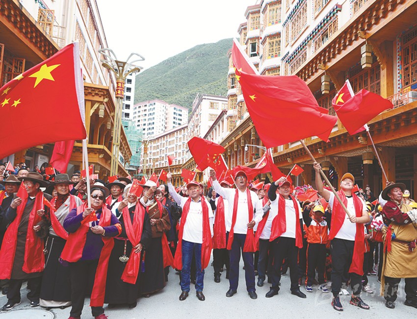 伴隨著悠揚(yáng)的旋律,在當(dāng)?shù)馗袼_爾藝術(shù)團(tuán)演員的帶領(lǐng)和感染下,幾千名當(dāng)?shù)馗刹咳罕娚碇A服,揮舞著手中的五星紅旗,懷著無(wú)比激動(dòng)的心情獻(xiàn)歌祖國(guó),同唱《我和我的祖國(guó)》。深情激昂的歌聲感染到在場(chǎng)的每一個(gè)人,有的高呼喝彩、有的熱淚盈眶,齊聚在鮮紅的國(guó)旗下,齊聲高喊:“我愛(ài)祖國(guó),祖國(guó)萬(wàn)歲!”