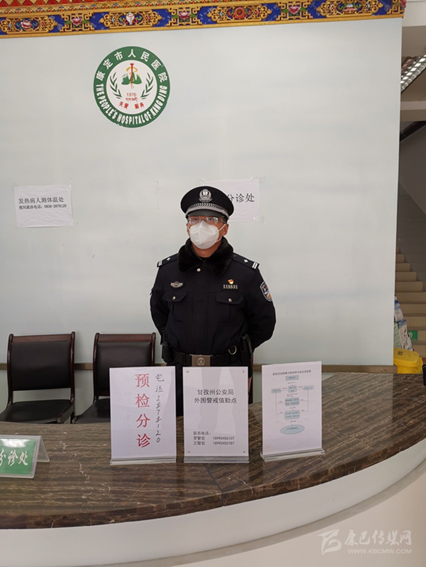 民警在康定市人民醫(yī)院預(yù)檢分診臺(tái)執(zhí)行外圍警戒任務(wù)。