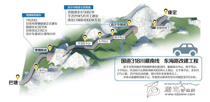 國道318川藏南線是四川進藏大通道之一,也是甘孜藏族自治州境內(nèi)極其重要的交通主干道之一。2011年啟動建設的東海路改建工程,按三級公路標準改建,起于甘孜州康定市新都橋鎮(zhèn)東俄洛村,翻越高爾寺山、剪子彎山、卡子拉山、托洛拉卡山四座海拔4000米以上高山,止于海子山,全長約275公里。