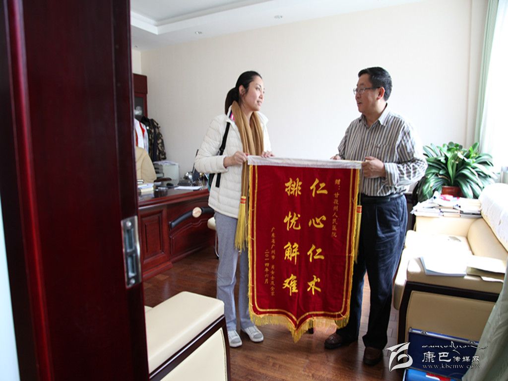 多吉院長(zhǎng)代表醫(yī)院接受來自廣州的肖女士贈(zèng)送的錦旗。