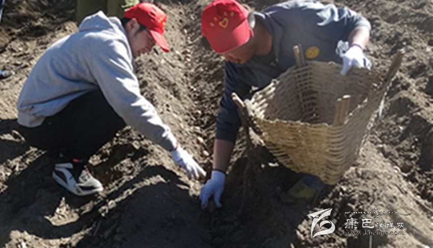 2名志愿者在幫助貧困戶種植土豆。