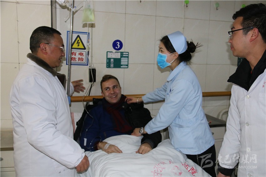 和國醫(yī)生正在給臨床病人檢查病情。一位來康定玩的俄羅斯小伙因患重感冒住進了急救中心。正在輸液的他用比較熟練的中文激動地告訴記者:“這里的醫(yī)生服務很好,他們過年都沒有休息,我得了重感冒,經(jīng)過治療以及在他們的細心關(guān)照下,我的病情好多了?!?/span>