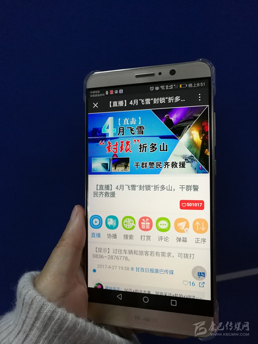 一路上,記者通過甘孜日報微信平臺,將救援情況和群眾的實況,第一時間進行了直播。隨著一條條現(xiàn)場圖片、文字和視頻的及時發(fā)布,人們第一時間得知了折多山受困車輛和群眾得到救助的實際情況,人們紛紛在直播平臺留言,為交通、路政和當?shù)攸h委、政府的救援行動點贊。在對折多山強降雪和受堵現(xiàn)場進行直播報道的同時,甘孜日報社還利用直播平臺,回顧了折多山道路交通難的歷史,并再次發(fā)布雅康高速修建、折多山隧道立項等重大交通建設(shè)工程的進展情況,又對此次折多山風(fēng)雪阻斷道路交通,導(dǎo)致車輛和人群滯留的特殊原因進行了報道和澄清,并報道了風(fēng)雪中仍有不少徒步游客繼續(xù)甘孜之旅的情況,第一時間讓更多的人了解到,飛雪并未對道路造成致命影響,甘孜州的道路交通狀況和應(yīng)急處置能力已經(jīng)得到了極大的提升,完全有能力保障人們出行以及生命、財產(chǎn)安全。