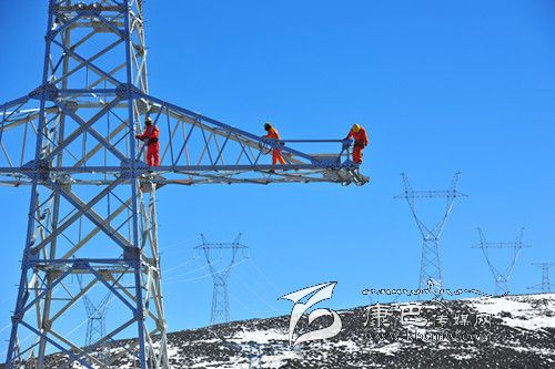 電力天路川藏聯(lián)網(wǎng)工程特別報道 11月中旬,寒風凜冽,滴水成冰。為確保我州“電力天路”無電地區(qū)和農(nóng)網(wǎng)改造建設工程明年3月份按時完工 ,四川電力公司的各路建設者,依舊保持 著旺盛的工作斗志,吃住在各施工現(xiàn)場,奮戰(zhàn)在高寒缺氧地域。圖為11月12日,電力員工奮戰(zhàn)在雅江縣境內(nèi)海拔 4412米的施工地段,登塔作業(yè)。 (楊林 攝影報道)