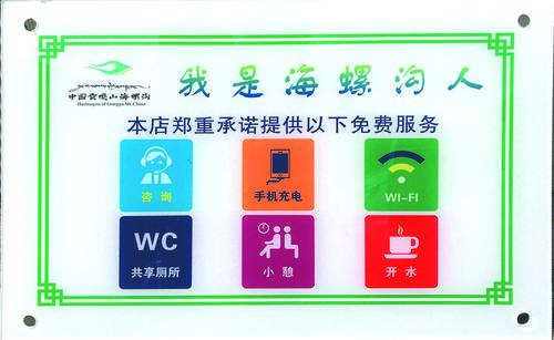“我們長征大酒店在提高服務質量的同時也掛了這個牌子,我們承諾為客人提供免費的開水、充電、共享廁所等服務,讓客人對海螺溝有一個美好的印象,在海螺溝過的開心愉快。”長征大酒店負責人楊德黎說。