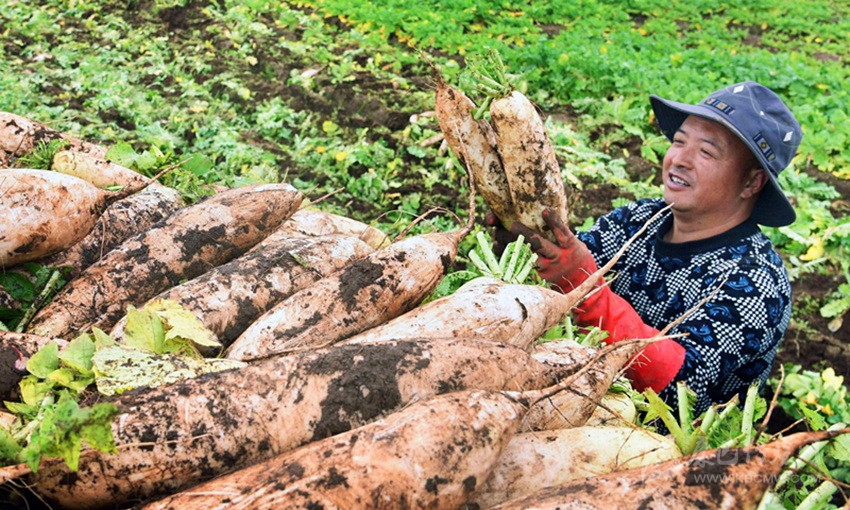 2018年12月22日,在海拔3600米的理塘縣濯桑鄉(xiāng)康藏陽光蔬菜生產(chǎn)加工基地,村民們正在采收水果蘿卜。這批水果蘿卜將遠銷港澳市場。水果蘿卜在香港的零售價是每公斤20港元,約合人民幣17元多。
