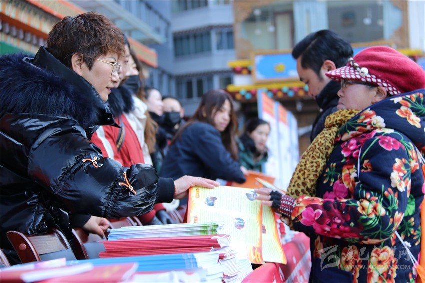 活動現場,工作人員為市民發(fā)放民族團結進步宣傳品、民族團結進步藏漢雙語宣傳教育讀本、宣傳畫、宣傳折頁、宣傳掛歷、《中國民族報》甘孜州民族團結???、《民族》雜志甘孜州民族團結專刊等各類宣傳資料9800余份(本),擺放展板30個。來自丹巴縣的仁真說:”現在的幸福生活離不開偉大的中國共產黨的領導,也離不開全國各族人民共同團結奮斗、共同繁榮發(fā)展?!?/p>