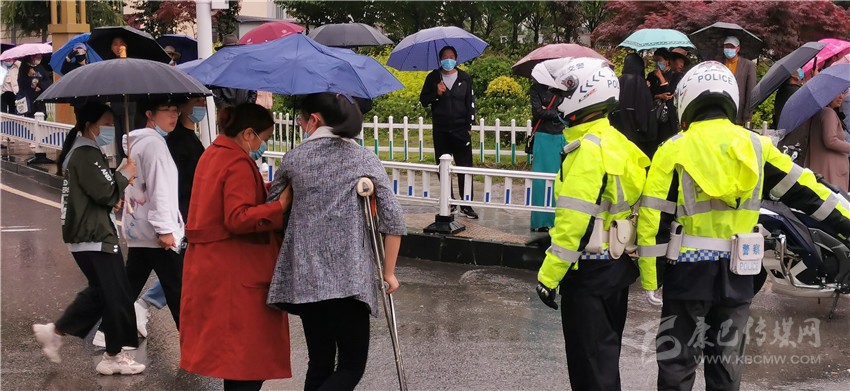 這邊剛幫助考生尋回遺失的準(zhǔn)考證,那邊一名杵著拐杖的考生引起了執(zhí)勤交警的注意,這時這名考生在家長的攙扶下正準(zhǔn)備過馬路,交警見狀,立即上前為其疏導(dǎo)交通,開辟出綠色通道。記者了解到,這名考生叫段尚玲,兩周前意外摔傷了腿,這給她的應(yīng)試之路帶來了不少麻煩,幸好在交警的幫助下,她安全順利地進入了考場。