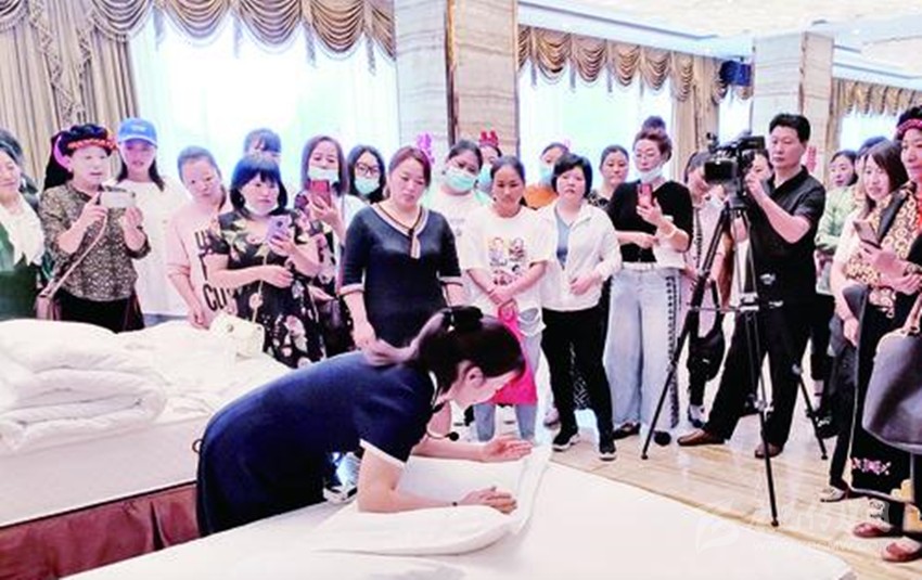 先檢查床箱與床墊是否吻合,床墊拉出40公分,鋪床前撣去床上毛發(fā),接下來開始甩單,床單正面朝上,床單中線居中,兩邊吊邊均等,甩單動作簡單瀟灑,準(zhǔn)確到位。這是7月8日,稻城縣文旅行業(yè)從業(yè)人員培訓(xùn)會上,筆者見到學(xué)員在教師的指導(dǎo)下表演的精彩一幕。