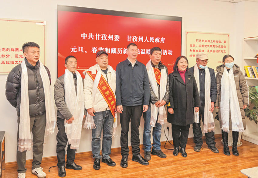 州委常委、統(tǒng)戰(zhàn)部長(zhǎng)、州總工會(huì)主席游祥飛( 左四 )慰問(wèn)勞模和困難職工。
