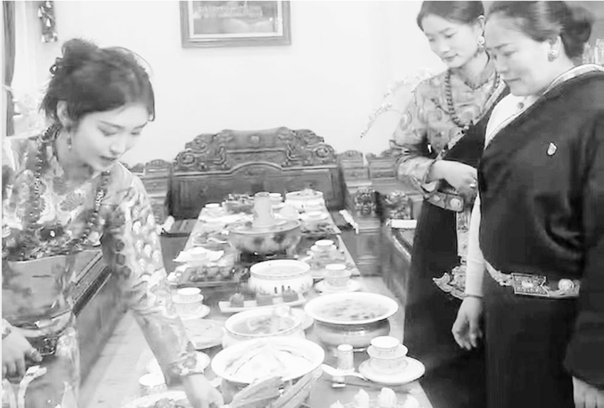 在藏裝制作點(diǎn),主持人穿上縫紉藝人們親手制作的服裝,無(wú)論布料、絲線的選用,還是精致繁復(fù)的技藝,都充滿了濃厚的鄉(xiāng)土氣息和民族特色。每一針每一線,都蘊(yùn)含著藝人們的心血與智慧。她們憑借著精湛的手藝,將絢麗多彩的布料剪裁、縫合,賦予其靈動(dòng)的生命力。石渠服飾十分重視色塊與整體的相襯與和諧,以紅、黃、藍(lán)、綠、白、黑為主,呈現(xiàn)了石渠人民尊重自然的生態(tài)美。