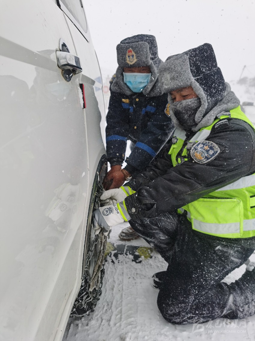 圖為錯阿卡點民警幫助過往車輛安裝防滑鏈。