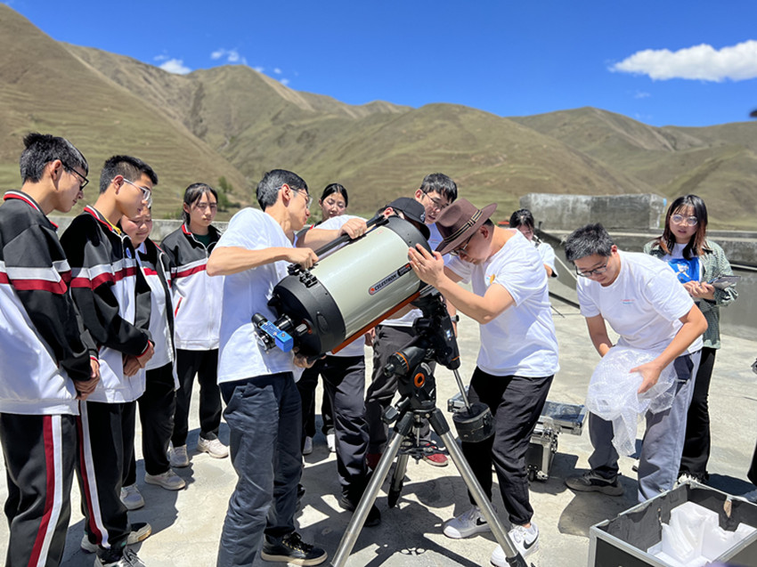 “向天空出發(fā)”公益幸福團成員向?qū)W生講解天文望遠鏡工作原理。