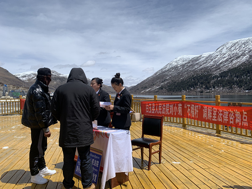 白玉縣法院干警在旅游景區(qū)為游客提供便捷司法服務。