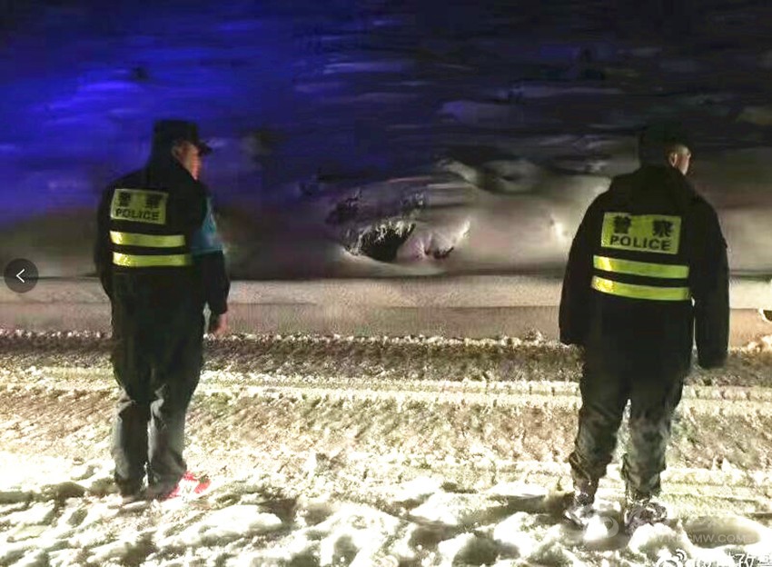 康定市公安局組織60余名警力連夜上山排堵疏導,鋪灑防滑沙,幫助過往車輛上掛鏈條,被困司乘人員逐漸離開折多山。