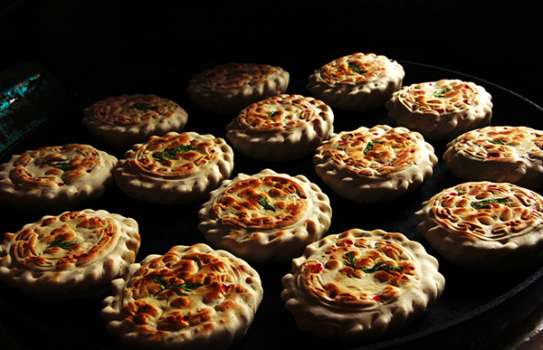 何謂“花饃饃”,顧名思義,就是用面粉做成的一種夾心并模印圖案的薄餅。一般“花饃饃”的厚度約一指厚,直徑為13厘米左右。制作“花饃饃”時(shí),一定要用新打出的本地面粉(用新面意為喜慶豐收)并不加發(fā)酵的老面(主要防止饃饃以及饃饃上的圖案變形),只加少許蘇打以水揉面即可。心子是由藏族特有的食品酥油、糌粑、奶渣等拌上紅糖或白糖而成。先將揉好的面粉揉成巴掌大的面坨,把調(diào)好的心子包在面坨內(nèi),然后壓平,盡量使它變成圓形,并在“花饃饃”的最中心粘一小片青綠的蘿卜葉,然后用雕有各種圖案的印板印上圖案。