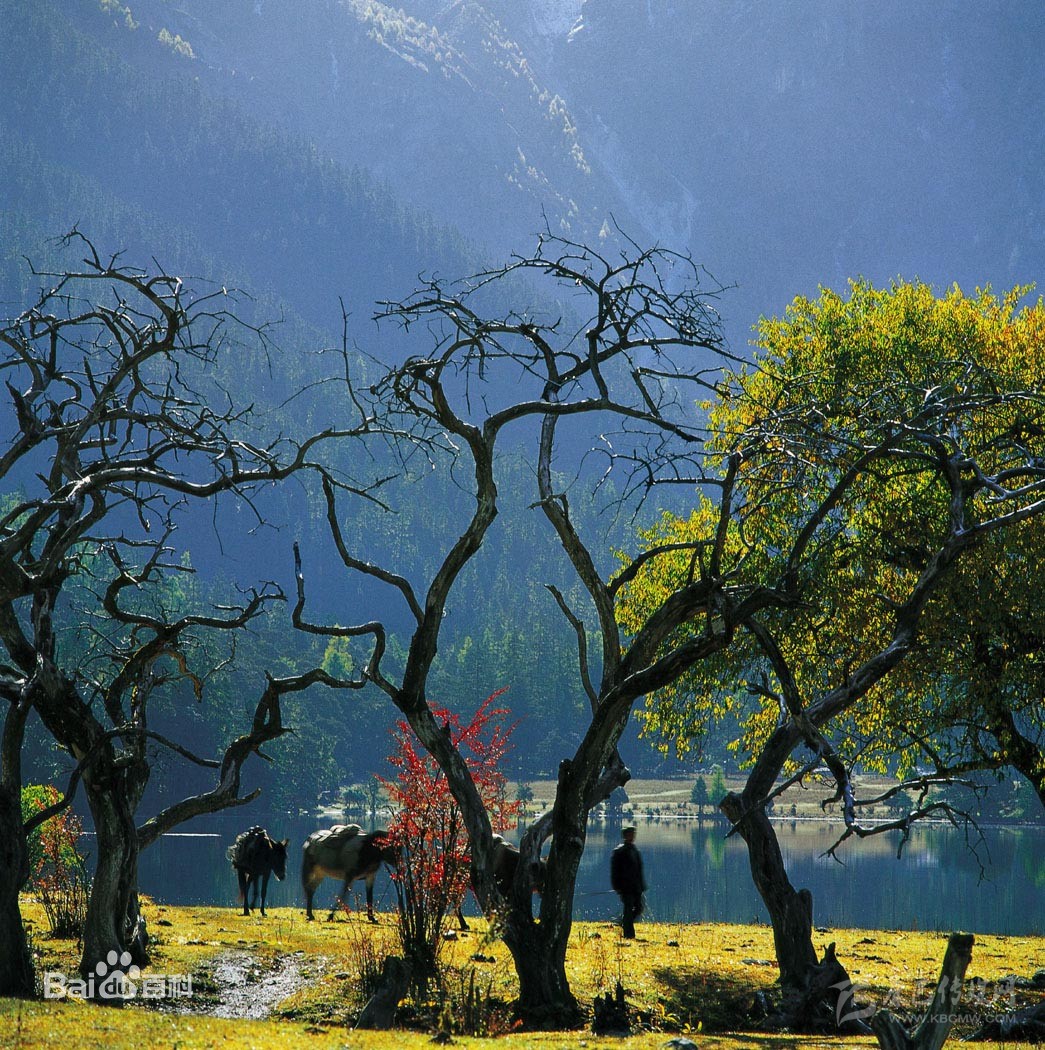 伍須海,湖面海拔3760m,長約1200m,寬為600m,最深處達(dá)33m。湖水由冰雪融水和地下水供給,東南泄入伍須溝,匯至九龍河。在伍須海的南北聳立著兩座梳子形的山峰,巍峨壯觀,西方是浪古則雪山,東南邊至朗加達(dá)卡山梁,南距伍須鋪子是各具形態(tài)十二姊妹峰。美麗的伍須海幽靜而神奇,完全保持著原始生態(tài)。